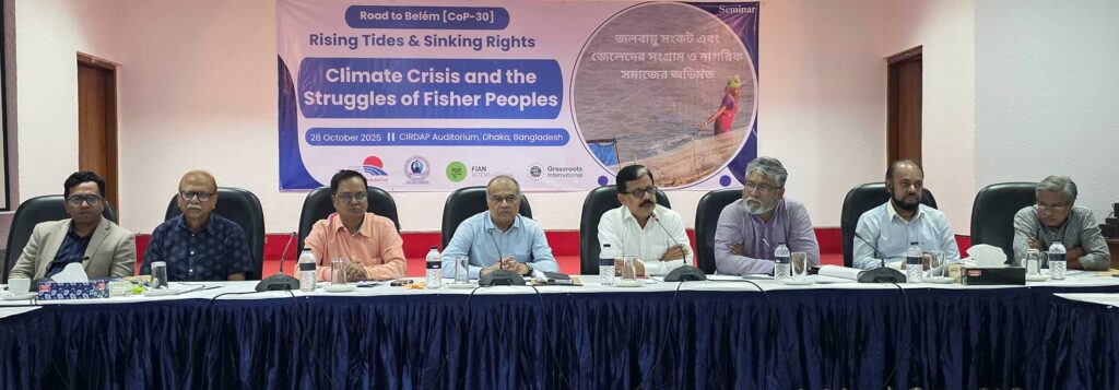 বৈশ্বিক জলবায়ু সংকটে জেলে ও উপকূলীয় জনগোষ্ঠী সর্বাধিক ঝুঁকিপূর্ণ ও ক্ষতিগ্রস্থ, টেকসই উদ্যোগের অভাবে তারা আজ মৌলিক মানবাধিকার, বিশেষ করে খাদ্য, পুষ্টি, শিক্ষা, স্বাস্থ্য, সুপেয় পানি, আবাসন, ও সাংস্কৃতিক অধিকার থেকে বঞ্চিত হচ্ছে, এটা স্বীকার করে নিয়ে জলবায়ু নীতি-পরিকল্পনার আলোচনা, সিদ্ধান্ত গ্রহণ ও বাস্তবায়নের সর্বস্তরে ক্ষুদ্র জেলে ও উপকূলীয় জনগোষ্ঠীর অর্থপূর্ণ অশগ্রহণ নিশ্চিত করতে হবে, সুরক্ষা ও মানবাধিকার বিষয়গুলো অগ্রাধিকার ভিত্তিতে অর্ন্তভুক্ত করতে হবে, জীবন, জীবিকা ও মানবাধিকার সমুন্নত রাখতে পর্যাপ্ত ও সময়পোযগী ক্ষতিপূরণ নিশ্চিত করাসহ বিভিন্ন দাবি জানিয়েছেন নাগরিক সমাজের নেতৃবৃন্দরা।